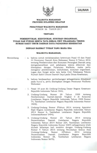 Peraturan Walikota Makassar Nomor 56 Tahun 2017 Tentang Pembentukan, Kedudukan, Susunan Organisasi, Tugas Dan Fungsi Serta Tata Kerja Unit Pelaksana .............
