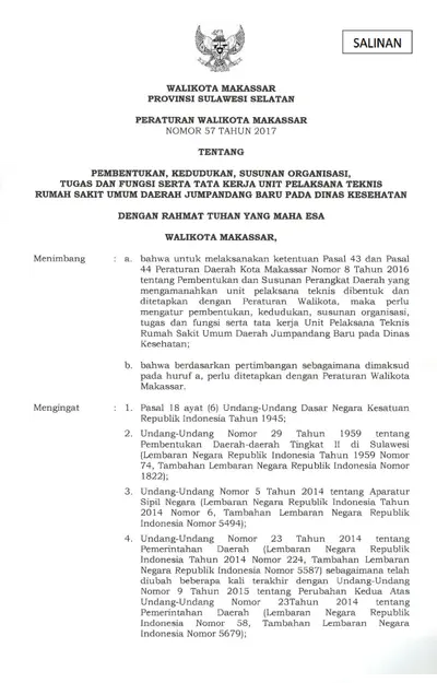 Peraturan Walikota Makassar Nomor 57 Tahun 2017 Tentang Pembentukan, Kedudukan, Susunan Organisasi, Tugas Dan Fungsi Serta Tata Kerja Unit Pelaksana .............