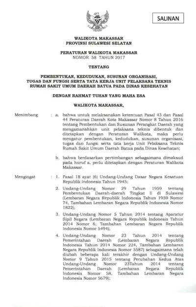 Peraturan Walikota Makassar Nomor 58 Tahun 2017 Tentang Pembentukan, Kedudukan, Susunan Organisasi, Tugas Dan Fungsi Serta Tata Kerja Unit Pelaksana .............