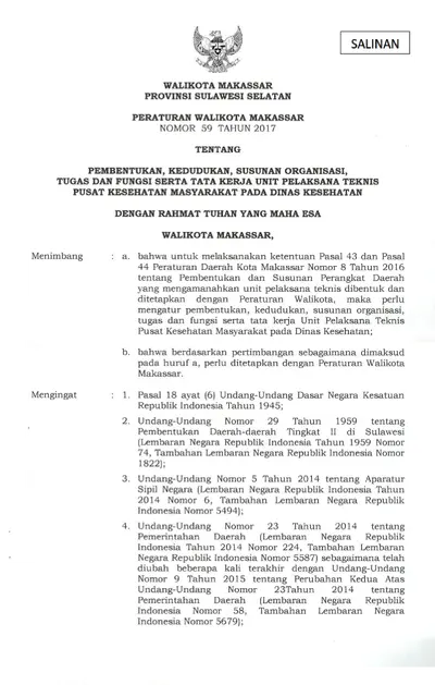 Peraturan Walikota Makassar Nomor 59 Tahun 2017 Tentang Pembentukan, Kedudukan, Susunan Organisasi, Tugas Dan Fungsi Serta Tata Kerja Unit Pelaksana .............