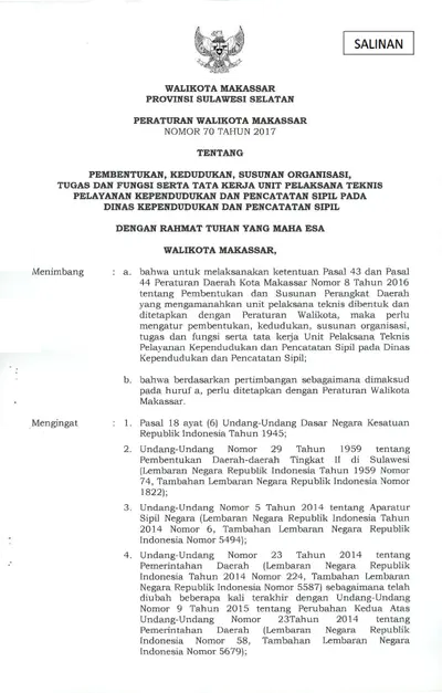 Peraturan Walikota Makassar Nomor 70 Tahun 2017 Tentang Pembentukan, Kedudukan, Susunan Organisasi, Tugas Dan Fungsi Serta Tata Kerja Unit Pelaksana .............