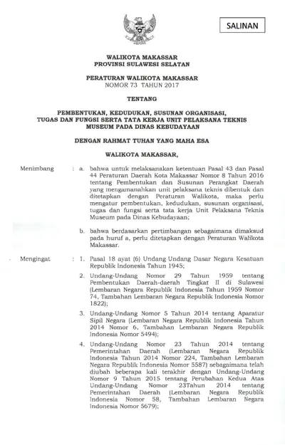 Peraturan Walikota Makassar Nomor 73 Tahun 2017 Tentang Pembentukan, Kedudukan, Susunan Organisasi, Tugas Dan Fungsi Serta Tata Kerja Unit Pelaksana .............