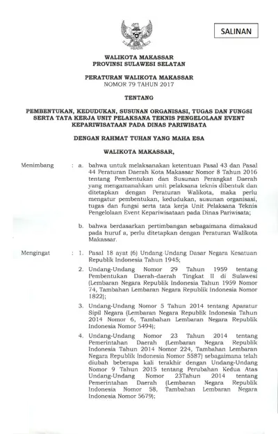 Peraturan Walikota Makassar Nomor 79 Tahun 2017 Tentang Pembentukan, Kedudukan, Susunan Organisasi, Tugas Dan Fungsi Serta Tata Kerja Unit Pelaksana .............