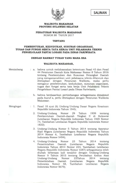 Peraturan Walikota Makassar Nomor 80 Tahun 2017 Tentang Pembentukan, Kedudukan, Susunan Organisasi, Tugas Dan Fungsi Serta Tata Kerja Unit Pelaksana .............