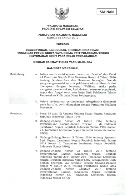 Peraturan Walikota Makassar Nomor 81 Tahun 2017 Tentang Pembentukan, Kedudukan, Susunan Organisasi, Tugas Dan Fungsi Serta Tata Kerja Unit Pelaksana .............