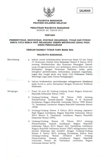 Peraturan Walikota Makassar Nomor 82 Tahun 2017 Tentang Pembentukan, Kedudukan, Susunan Organisasi, Tugas Dan Fungsi Serta Tata Kerja Unit Pelaksana .............