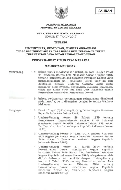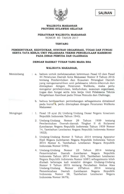 Peraturan Walikota Makassar Nomor 83 Tahun 2017 Tentang Pembentukan, Kedudukan, Susunan Organisasi, Tugas Dan Fungsi Serta Tata Kerja Unit Pelaksana .............