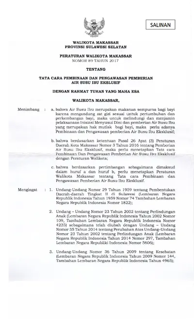 Peraturan Walikota Makassar Nomor 89 Tahun 2017 Tentang Tata Cara Pembinaan Dan Pengawasan Pemberian Air Susu Ibu Ekslusif