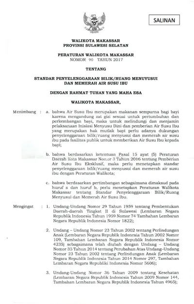 Peraturan Walikota Makassar Nomor 90 Tahun 2017 Standar Penyelenggaraan Bilik/ruang Menyusui Dan Memerah Air Susu Ibu