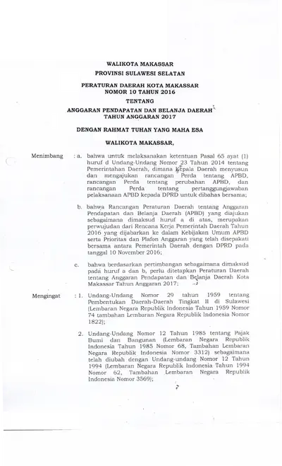 Peraturan Daerah Kota Makassar Nomor 10 Tahun 2016 Tentang Anggaran Pendapatan Dan Belanja Daerah