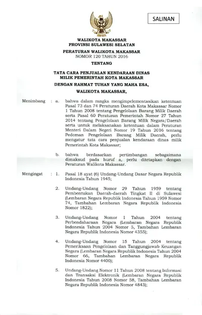 Peraturan Walikota Makassar Nomor 120 Tahun 2016 Tentang Tata Cara Penjualan Kendaraan Dinas Milik Pemerintah Kota Makassar