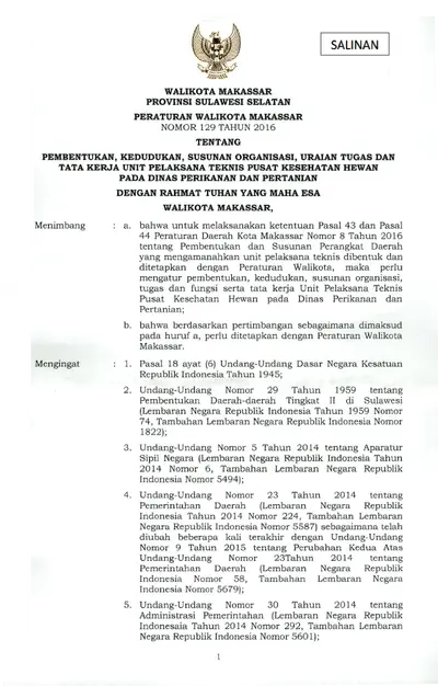 Peraturan Walikota Makassar Nomor 129 Tahun 2016 Tentang Pembentukan, Kedudukan, Susunan Organisasi, Uraian Tugas Dan Tata Kerja Unit Pelaksana .............