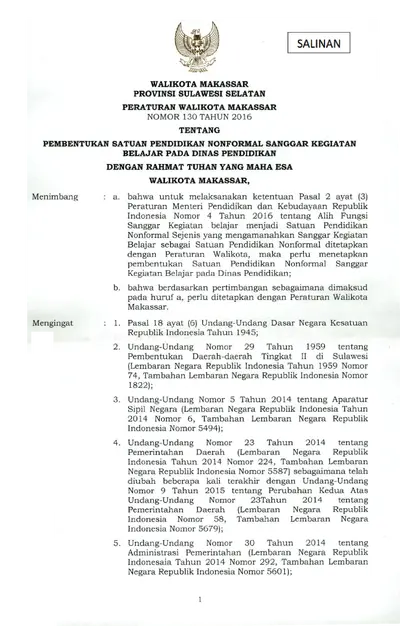 Peraturan Walikota Makassar Nomor 130 Tahun 2016 Pembentukan Satuan Pendidikan Non Formal Sanggar Kegiatan Belajar Pada Dinas Pendidikan