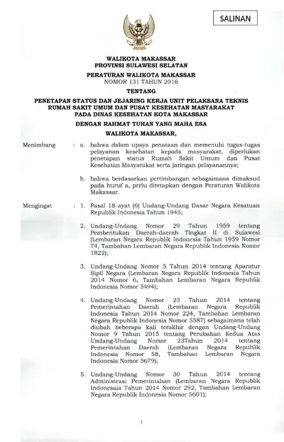Peraturan Walikota Makassar Nomor 131 Tahun 2016 Tentang Penetapan Status Dan Jejaring Kerja Unit Pelaksana Teknis Rumah Sakit Umum Dan Pusat .............