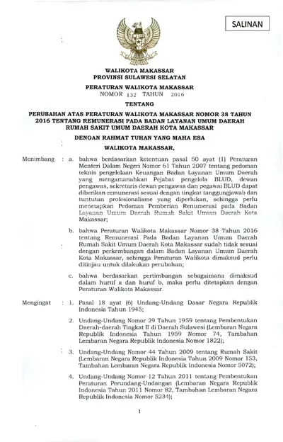 Peraturan Walikota Makassar Nomor 132 Tahun 2016 Tentang Perubahan Atas Peraturan Walikota Makassar Nomor 38 Tahun 2016 Tentang Remunerasi Pada Badan .............