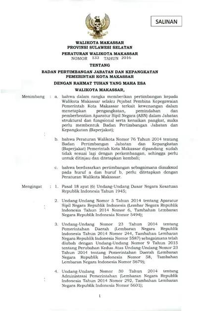 Peraturan Walikota Makassar Nomor 133 Tahun 2016 Tentang Badan Pertimbangan Jabatan Dan Kepangkatan Pemerintah Kota Makassar