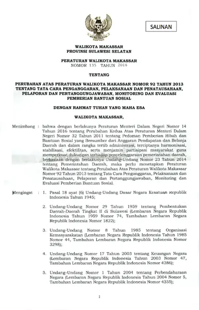 Peraturan Walikota Makassar Nomor 135 Tahun 2016 Tentang Perubahan Atas Peraturan Walikota Makassar Nomor 92 Tahun 2013 Tentang Tata Cara .............