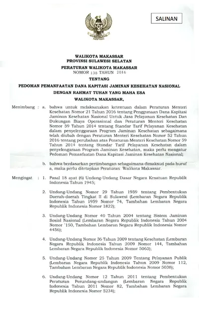 Peraturan Walikota Makassar Nomor 138 Tahun 2016 Tentang Pedoman Pemanfaatan Dana Kapitasi Jaminan Kesehatan Nasional