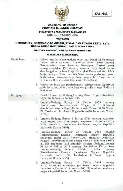 Peraturan Walikota Makassar Nomor 97 Tahun 2016 Tentang Kedudukan, Susunan Organisasi, Tugas Dan Fungsi Serta Tata Kerja Dinas Komunikasi Dan .............