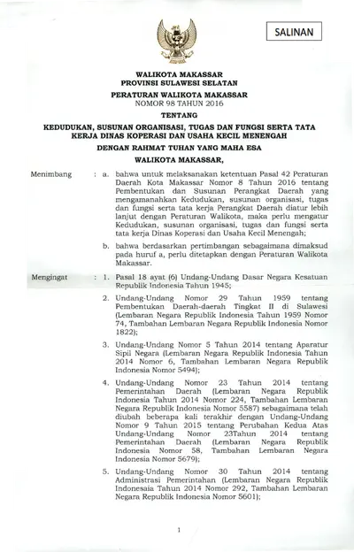 Peraturan Walikota Makassar Nomor 98 Tahun 2016 Tentang Kedudukan, Susunan Organisasi, Tugas Dan Fungsi Serta Tata Kerja Dinas Koperasi Dan Usaha .............