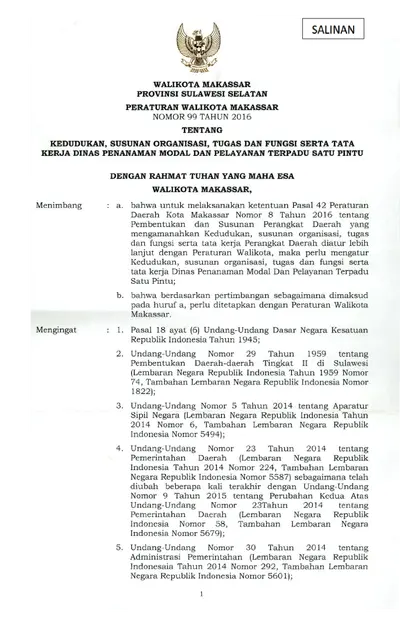 Peraturan Walikota Makassar Nomor 99 Tahun 2016 Tentang Kedudukan, Susunan Organisasi, Tugas Dan Fungsi Serta Tata Kerja Dinas Penanaman Modal Dan .............