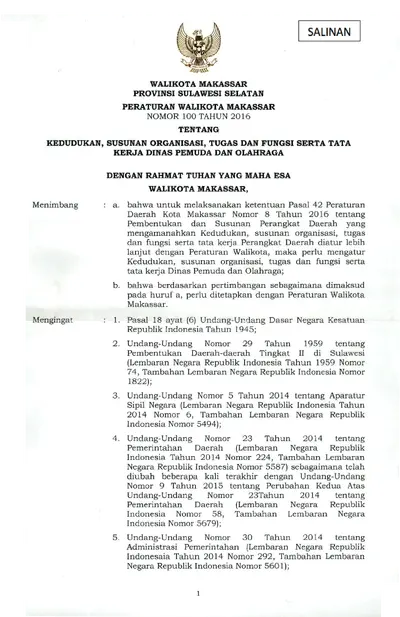 Peraturan Walikota Makassar Nomor 100 Tahun 2016 Tentang Kedudukan, Susunan Organisasi, Tugas Dan Fungsi Serta Tata Kerja Dinas Pemuda Dan Olahraga