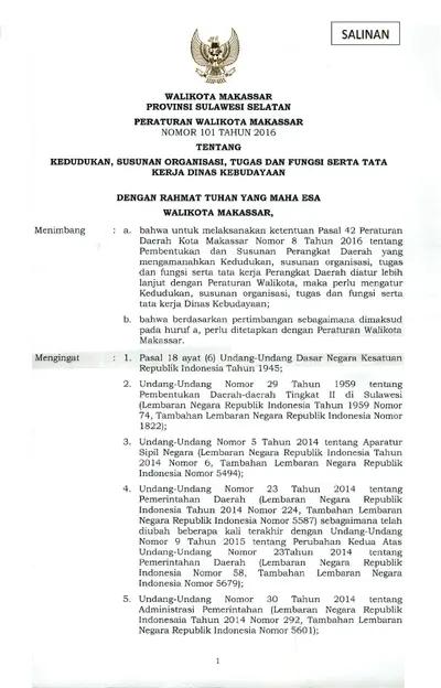 Peraturan Walikota Makassar Nomor 101 Tahun 2016 Tentang Kedudukan, Susunan Organisasi, Tugas Dan Fungsi Serta Tata Kerja Dinas Kebudayaan