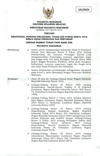 Peraturan Walikota Makassar Nomor 102 Tahun 2016 Tentang Kedudukan, Susunan Organisasi, Tugas Dan Fungsi Serta Tata Kerja Dinas Perikanan Dan .............