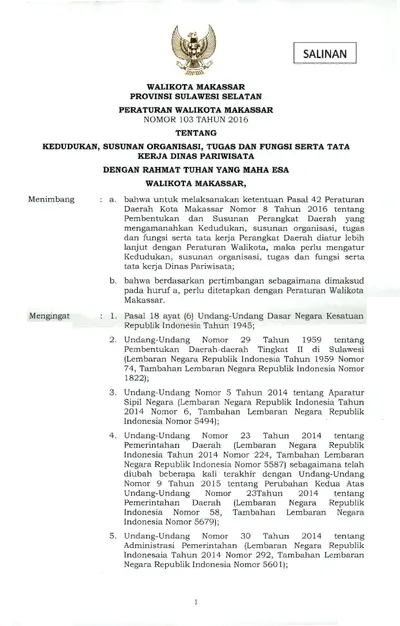 Peraturan Walikota Makassar Nomor 103 Tahun 2016 Tentang Kedudukan, Susunan Organisasi, Tugas Dan Fungsi Serta Tata Kerja Dinas Pariwisata