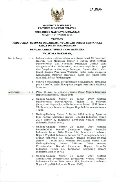 Peraturan Walikota Makassar Nomor 104 Tahun 2016 Tentang Kedudukan, Susunan Organisasi, Tugas Dan Fungsi Serta Tata Kerja Dinas Perdagangan