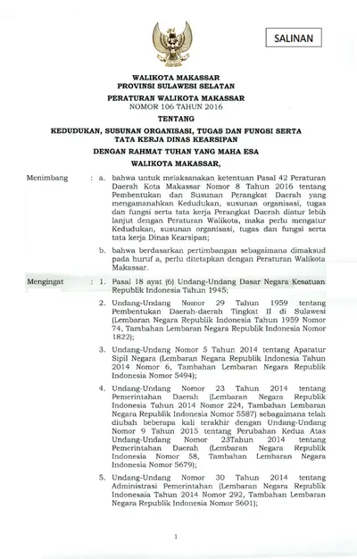 Peraturan Walikota Makassar Nomor 106 Tahun 2016 Tentang Kedudukan, Susunan Organisasi, Tugas Dan Fungsi Serta Tata Kerja Dinas Kearsipan