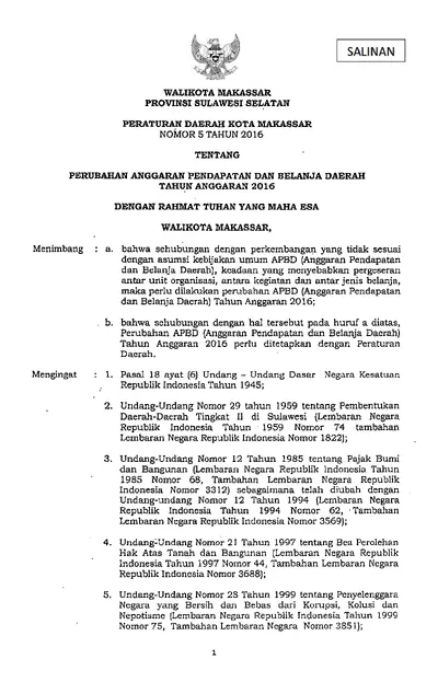 Peraturan Daerah Kota Makassar Nomor 5 Tahun 2016 Tentang Perubahan Anggaran Pendapatan Dan Belanja Daerah Tahun Anggaran 2016