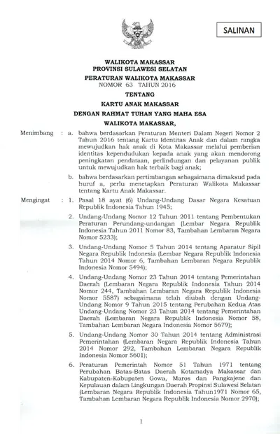 Peraturan Walikota Makassar Nomor 63 Tahun 2016 Tentang Kartu Anak Makassar