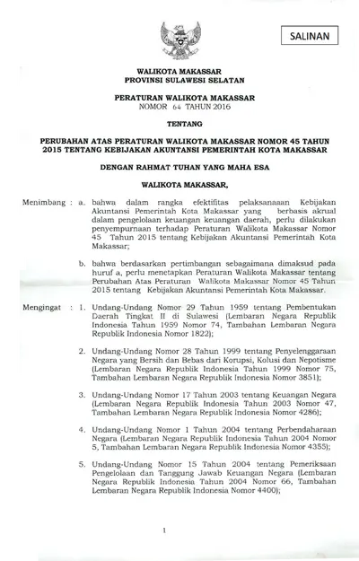 Peraturan Walikota Makassar Nomor 64 Tahun 2016 Tentang Perubahan Atas Peraturan Walikota Makassar Nomor 45 Tahun 2015 Tentang Kebijakan Akuntansi .............
