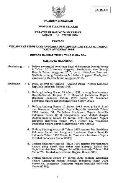 Peraturan Walikota Makassar Nomor 65 Tahun 2016 Tentang Penjabaran Perubahan Anggaran Pendapatan Dan Belanja Daerah Tahun Anggaran 2016