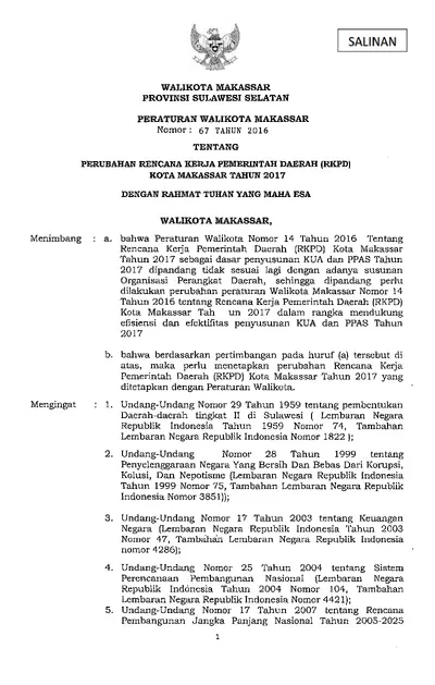 Peraturan Walikota Makassar Nomor 67 Tahun 2016 Tentang Perubahan Rencana Kerja Pemerintah Daerah (RKPD) Kota Makassar Tahun 2017