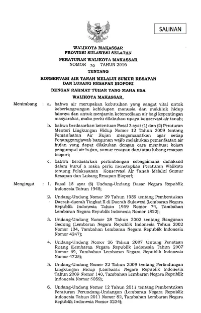 Peraturan Walikota Makassar Nomor 70 Tahun 2016 Tentang Konservasi Air Tanah Melalui Sumur Resapan Dan Lubang Resapan Biopori