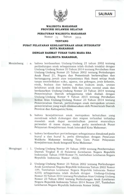 Peraturan Walikota Makassar Nomor 71 Tahun 2016 Tentang Pusat Pelayanan Kesejahteraan Anak Integratif Kota Makassar