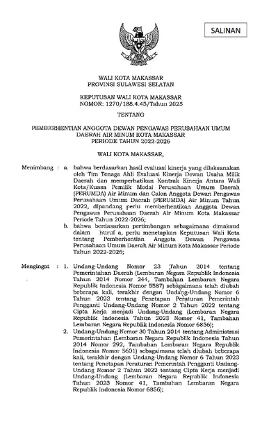 Keputusan Walikota Makassar Nomor 1270/188.4.45/Tahun 2025 Tentang Pemberhentian Anggota Dewan Pengawas Perusahaan Umum Daerah Air Minum Kota .............