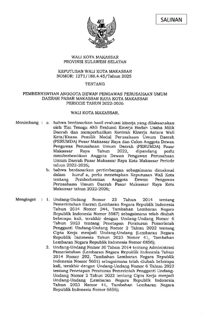 Keputusan Walikota Makassar Nomor 1271/188.4.45/Tahun 2025 Tentang Pemberhentian Anggota Dewan Pengawas Perusahaan Umum Daerah Pasar Makassar Raya .............
