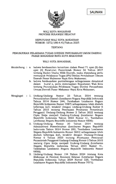 Keputusan Walikota Makassar Nomor 1272/188.4.45/Tahun 2025 Tentang Penunjukan Pelaksana Tugas Direksi Perusahaan Umum Daerah Pasar Makassar Raya Kota .............