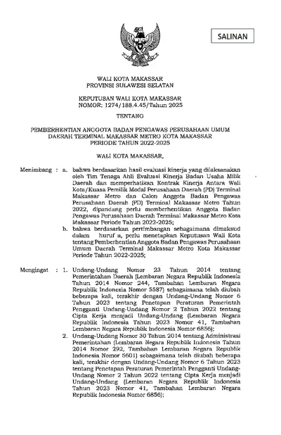 Keputusan Walikota Makassar Nomor 1274/188.4.45/Tahun 2025 Tentang Pemberhentian Anggota Badan Pengawas Perusahaan Umum Daerah Terminal Makassar .............