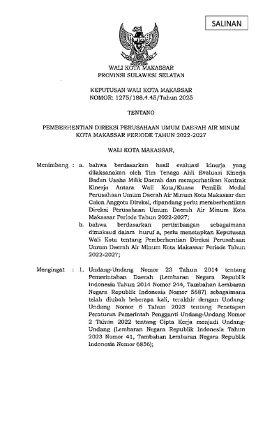 Keputusan Walikota Makassar Nomor 1275/188.4.45/Tahun 2025 Tentang Pemberhentian Direksi Perusahaan Umum Daerah Air Minum Kota Makassar Periode Tahun .............