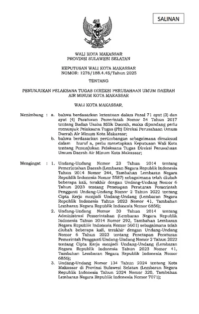 Keputusan Walikota Makassar Nomor 1276/188.4.45/Tahun 2025 Tentang Penunjukan Pelaksana Tugas Direksi Perusahaan Umum Daerah Air Minum Kota Makassar