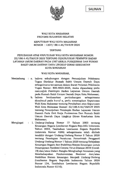 Keputusan Walikota Makassar Nomor 1307/188.4.45/Tahun 2025 Tentang Perubahan Atas Keputusan Wali Kota Makassar Nomor: 32/188.4.45/Tahun 2025 Tentang .............