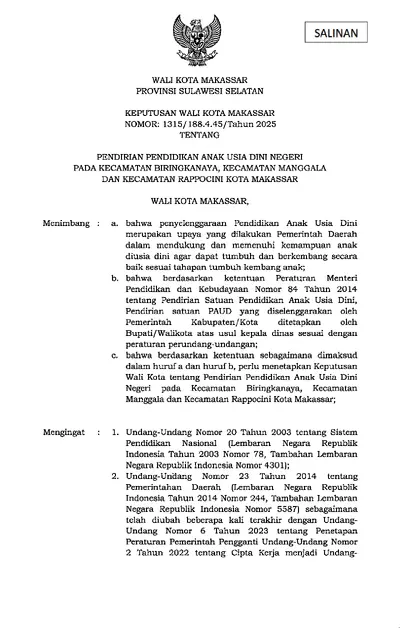 Keputusan Walikota Makassar Nomor 1315/188.4.45/ Tahun 2025 Tentang Pendirian Pendidikan Anak Usia Dini Negeri Pada Kecamatan Biringkanaya, Kecamatan .............