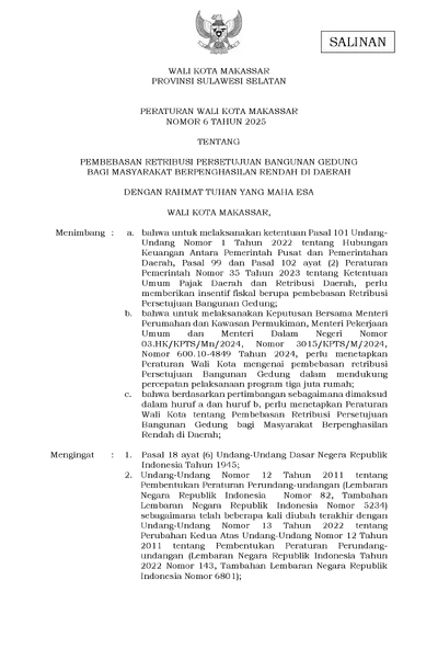 Peraturan Wali Kota Makassar Nomor 6 Tahun 2025 Tentang Pembebasan Retribusi Persetujuan Bangunan Gedung Bagi Masyarakat Berpenghasilan Rendah Di .............
