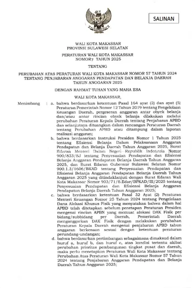 Peraturan Wali Kota Makassar Nomor 7 Tahun 2025 Tentang Perubahan Atas Peraturan Wali Kоtа Мakassar Nomor 57 Tahun 2024 Tentang Penjabaran .............