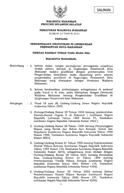 Peraturan Walikota Makassar Nomor 12 Tahun 2016 Tentang Pengendalian Gratifikasi Di Lingkungan Pemerintah Kota Makassar