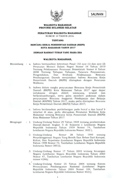 Peraturan Walikota Makassar Nomor 14 Tahun 2016 Rencana Kerja Pemerintah Daerah (RKPD) Kota Makassar Tahun 2017